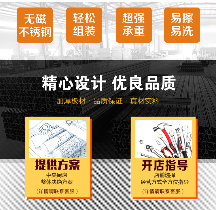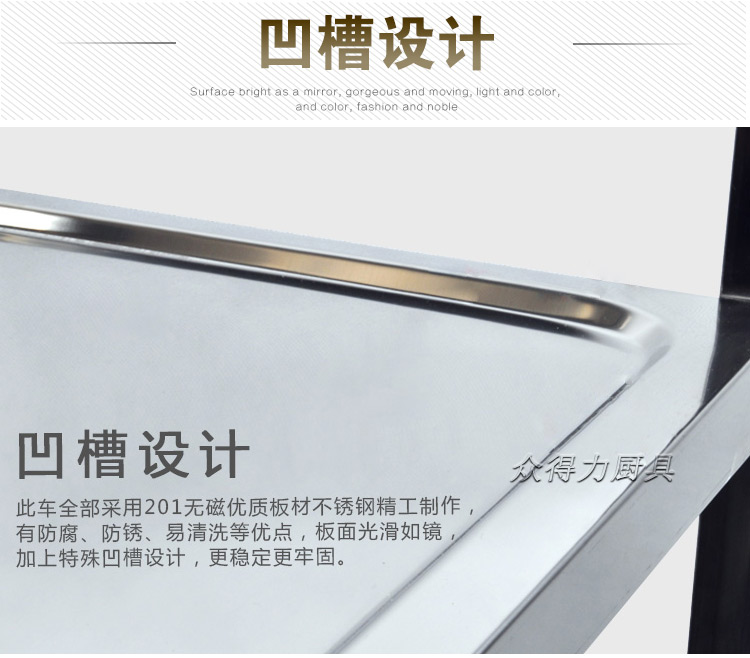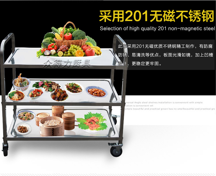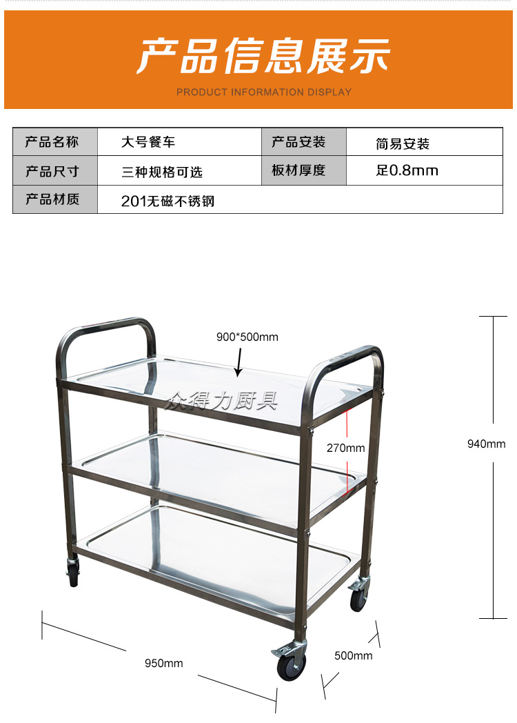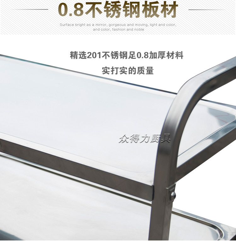 江西眾得力廚具有限公司生產(chǎn)銷售商用廚具,食品機(jī)械,提供中央廚房工程項(xiàng)目整體解決方案。不銹鋼餐車有大號(hào)、中號(hào)、小號(hào),本公司生產(chǎn)銷售的不銹鋼餐車系列均采用201無(wú)磁不銹鋼材質(zhì),板材厚度足0.8mm,整機(jī)拆裝方便,結(jié)構(gòu)牢固,承重能力強(qiáng)。